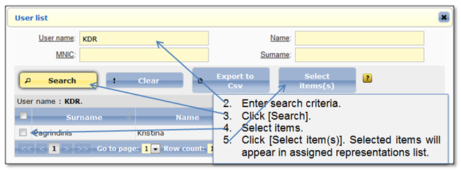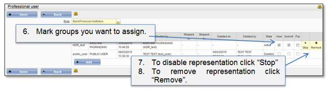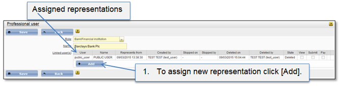 To assign representation from represented professionals list, the particular professional user has to be selected and opened. In opened page will be shown already assigned representations for this professional user. Administrator has right to assign as many users to this representation as needed.