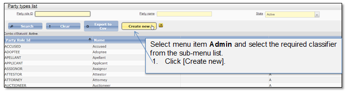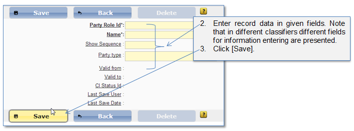 System administrator can create a new record for each classifier (Figure 56 - Figure 57). This chapter describes common guidelines how to create a new record in a classifier list. As an example Party type classifier will be used. Although particular fields in other classifiers may differ, the main principles of creating new record are the same.