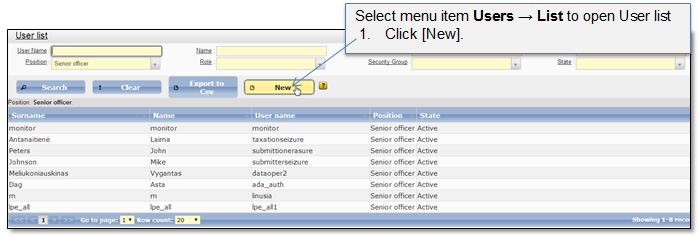 •Security group – defines user access to particular functions (in other words - visibility). I.e. if security group “Submission officer - professional”, is assigned to the user, he/she will be able to access Submission dashboard and to see professional submission entry records. Note that if the role “Submission officer” is not assigned to the user at the same time, he/she will not be able to perform any actions in the dashboard, e.g. to start a new professional process, because the required role is missing (although the user can see button [Start new professional registration], because security group “Submission officer professional” is assigned). Security groups can be administered via user interface, -. administrator can create, edit or remove existing security group (4.4 User group list). If the user is assigned with the particular security group, all functions which are assigned to the particular security group are available to the user.