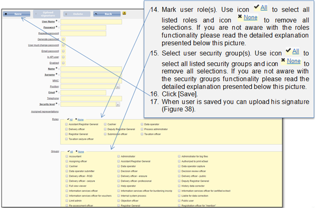 •Role – role describes user access to the particular registration process activity. In this context assigned role means that user will be able to perform a particular action in the system. I.e. if the Submission officer role is assigned to the user but there is no security group assigned, the user could handle the process because he/she has the required role but he/she will not be able to access the Submission dashboard, because if the security group “Submission officer – public” is not assigned. Note that roles are predefined and cannot be expanded via user interface.