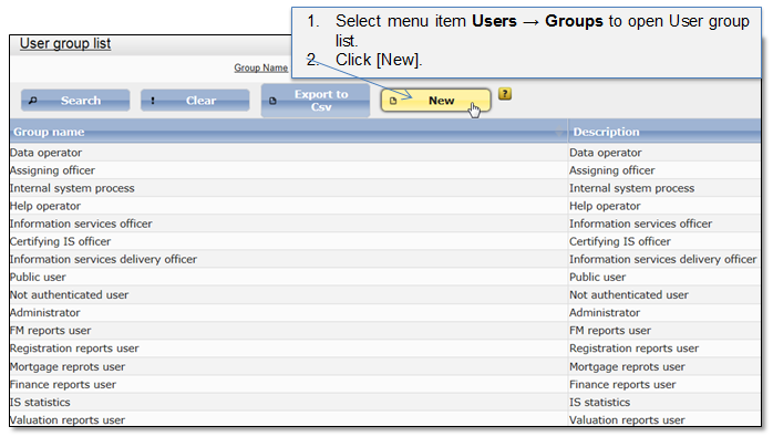 The functionality allows the administrator to create a new security group. The administrator creates a new security group record and selects authorization rights that will be included in the created security group (Figure 50 - Figure 51).