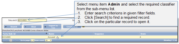 System administrator can delete an existing record from each classifier (Figure 60 - Figure 61). This chapter describes common guidelines how to delete an existing record. As an example Party type classifier will be used. Although particular fields in other classifiers may differ, the main principles of deleting classifier record are the same.