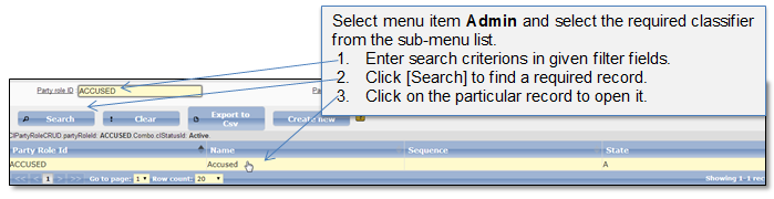 System administrator can edit an existing record in each classifier (Figure 58 - Figure 59). This chapter describes common guidelines how to edit an existing record in a classifier list. As an example Party type classifier will be used. Although particular fields in other classifiers may differ, the main principles of editing classifier record are the same.