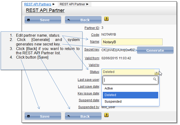 •Any user will not be authorized and will not be able to operate via API functionality if partner record in state “Deleted” or “Suspended”.
