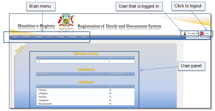 Once the user is successfully logged in, Mauritius e-Registry home page is opened. Also, after the user clicks menu item “Home”, he will always be navigated to this page (Figure 7).