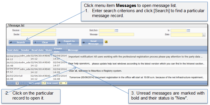 Message list contains all internal system announcements that have been created and sent to the system users. In this list administrator can search for a particular message and review it or create and send a new message (3.5.2 Create new message).