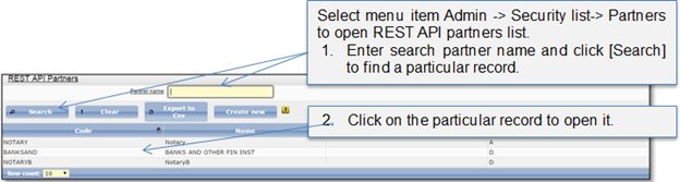 This classifier defines third party system which will integrate with Online API. Partner system acts on behalf of the individual representatives of the organization, who must be duly registered and active in the eRegistry online module. System administrator can use filter field to find and review any partner record. System administrator also can: