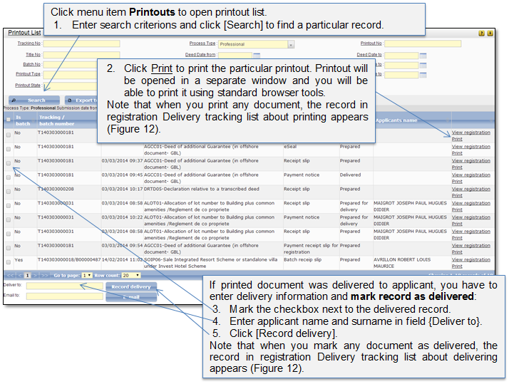 Each record in a Printout list (Figure 10) can be printed and delivered to the applicant (e.g. if applicant has his hard copy lost or corrupted). When the Printout list record is printed, the delivery fact must be recorded.