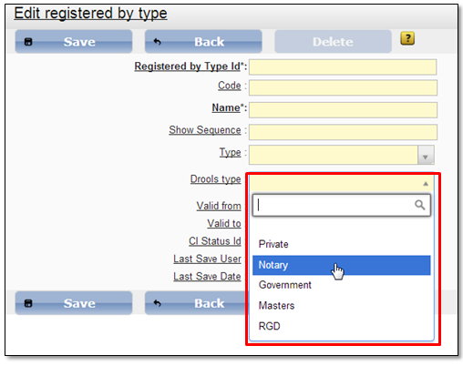 Select menu item “Admin → Document list → Registered by” to open the applicant types list. System administrator can create a new applicant type record (5.1.1 Create new classifier record). Note that when creating a new applicant type you have to select field {Drools type} (Figure 67) value responsibly. Drools type value defines tax calculation for this applicant type during the document/deed registration.