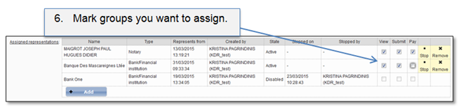 User can have one or few assigned representations. Assigned representation means that user can represent assigned user. It can be: bank / financial institution, notary, attorney, surveyor, court / master, dealers in motor vehicle.
