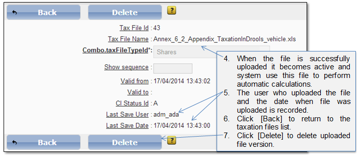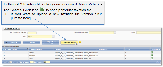 This classifier shows the list of taxation files (drools files) that are being used for automatic calculation. Select menu item “Admin → Taxation lists → Taxation files” to open the taxation files list (Figure 69). In this list system administrator can upload a new taxation file. Only the latest uploaded file versions are displayed and valid.