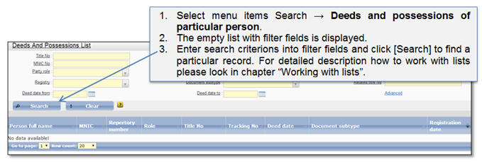 In the Deeds and possessions of particular person list you can search for the deeds where the person is indicated as a party and search for the list of possessions of the particular person. Deeds and possessions of particular person list (Figure 83) can be opened by choosing menu items Search → Search deeds and possessions of particular person. To make a search of a particular record, enter document parameters in filter fields displayed over the list.