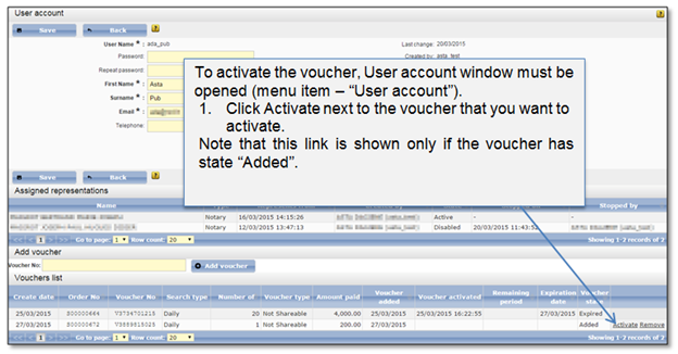 Public user can only activate vouchers which are in state “Added” (this means that the voucher has to be added to the user voucher list first (5.2.2 How to add a voucher)). When public user initiates voucher activation, the voucher state turns to “Activated”. The public user is able to access listed searches and the voucher validity period counting is started. When voucher validity period is over, voucher will turn to state “Expired” and the access to the Information services searches will be closed.