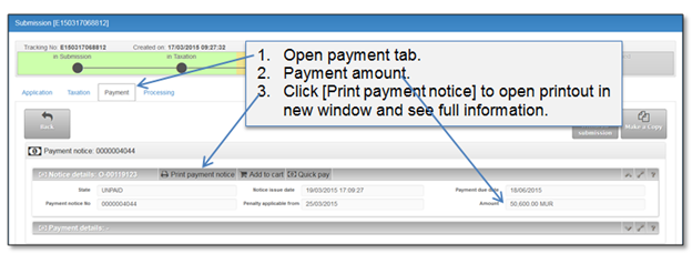 The basis of the payment is payment notice. After taxation is confirmed at the Back registration system, payment notice always is available in processing tab printouts list.