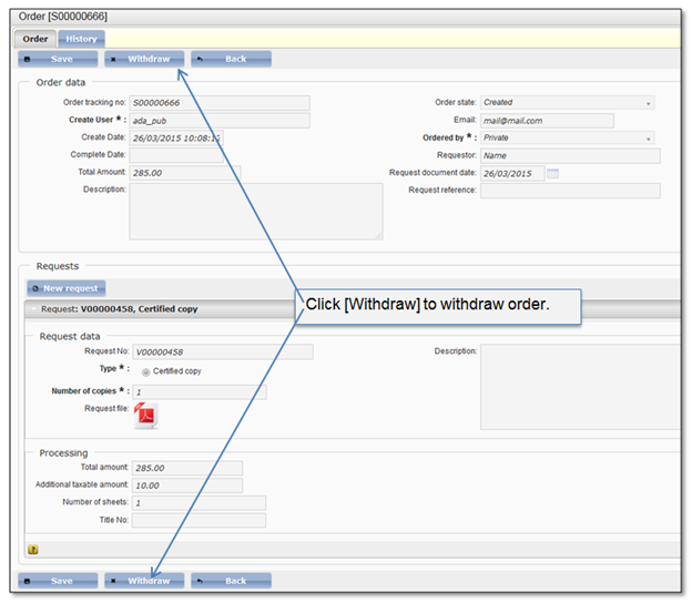 After order is submitted, and it is not paid, the user can withdraw request for certified copy. In order to withdraw an order (Certified copy), the particular order has to be opened.