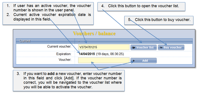 In the user panel you can see your current voucher parameters and you can also add a new voucher (Figure 59).