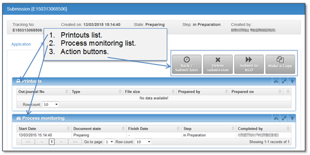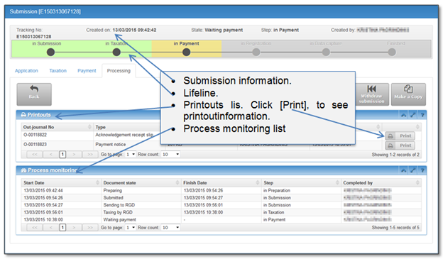 Processing tab will be complemented in future steps. The status of submission record is shown in the lifeline on the top of the page. The meaning of lifeline colors: