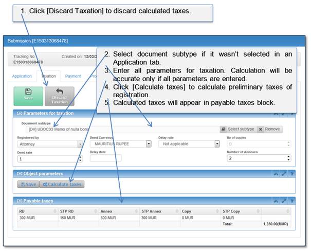 In taxation tab, before registration submission, online user has ability to calculate preliminary taxes. Note that calculated taxes are for the informational purposes only. The final decision on taxation will be made by RGD officer. After taxation step is completed by RGD officer, payment notice will be available in Processing tab (see 3.2.4 Processing).