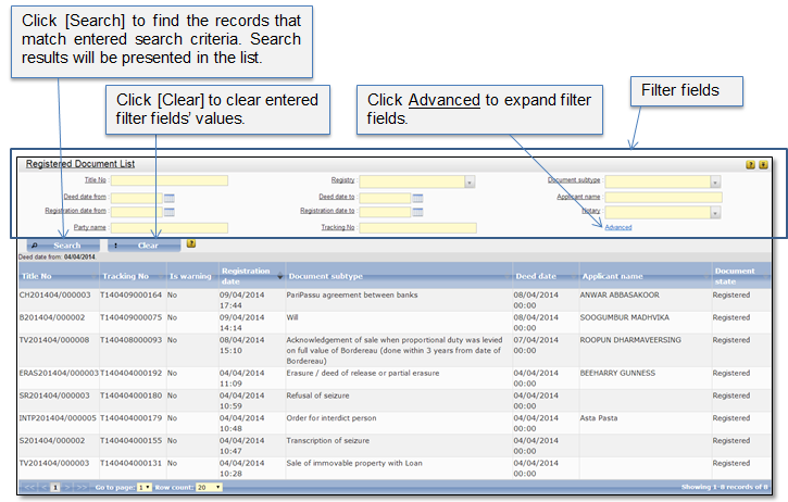5. Records that match selected criterions will be presented in the list. If there are entered several search criterions, system searches for the records that matches all of them.