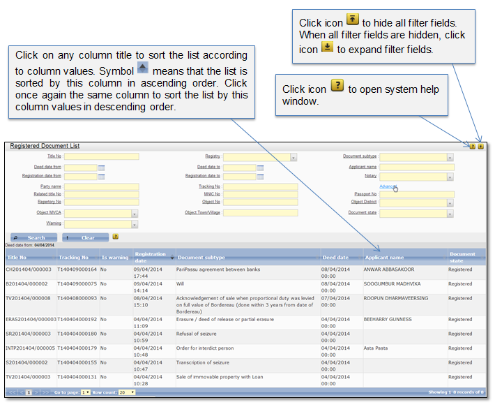 Information in the system is often displayed as a list. In this chapter general rules how to work with system lists are described. As the example, Registered document list will be used, which has almost all general list functionality (Figure 1, Figure 2, Figure 3).